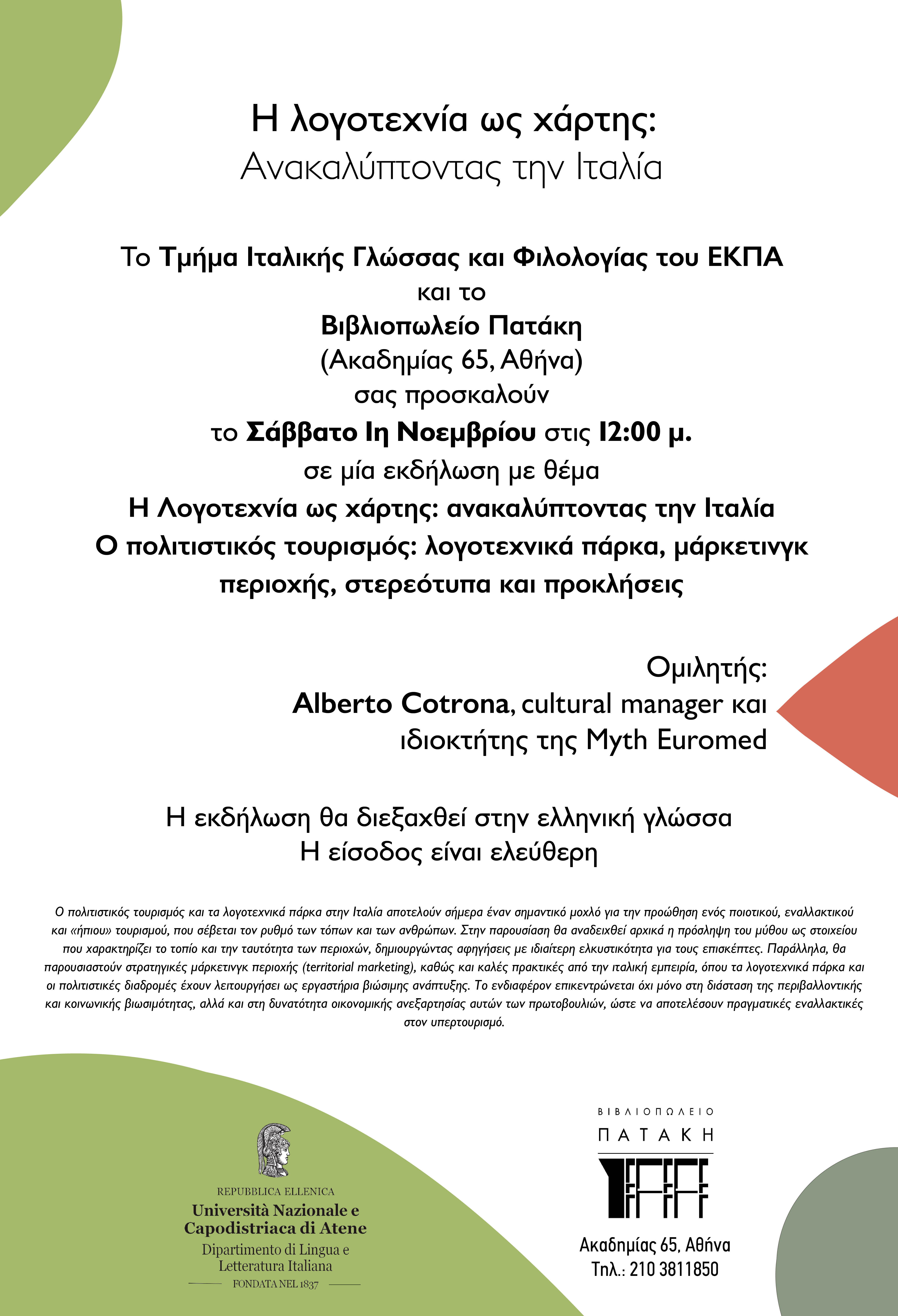 Οργάνωση: Τμήμα Ιταλικής Γλώσσας και Φιλολογίας ΕΚΠΑ - Φιλοξενία: Βιβλιοπωλείο Πατάκης - Ακαδημίας 65, Αθήνα
